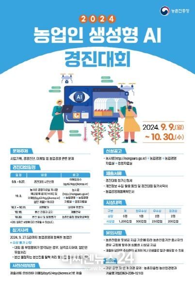 (비씨엔뉴스24) 농촌진흥청은 오는 10월 30일 개최되는 ‘2024 농업인 생성형 인공지능(AI) 경진대회’ 본선을 앞두고 9월 9일부터 27일까지 예선 참가 신청을 받는다.