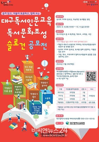 (비씨엔뉴스24) 대구시교육청은 9월 12일 12시부터 10월 11일 22시까지 대구광역시교육청 누리집을 통해 대구지역 학생, 학부모, 교직원, 시민 등을 대상으로 ‘대구독서인문교육 독서문화조성 슬로건’을 공모한다.