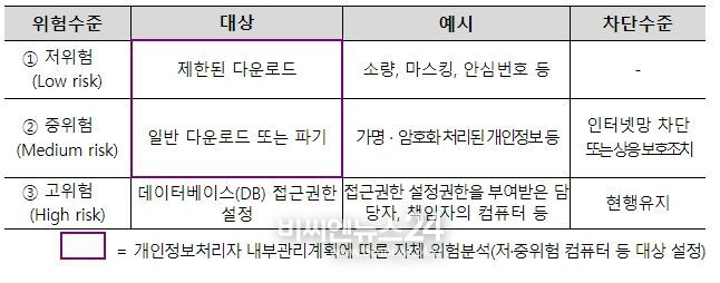 개인정보처리자는 내부관리계획에 따라 위험분석을 거쳐 위험수준을 구분해 저위험·중위험 컴퓨터 등에 대하여 인터넷망 차단조치 이외에 이와 상응하는 보호조치 하에서 제한된 인터넷망 접속도 허용하도록 완화할 방침이다.