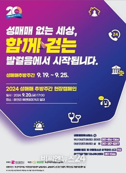 (비씨엔뉴스24) 부산시는 '2024년 성매매 추방주간'을 맞아 오늘(19일)부터 25일까지 '성매매 없는 세상, 함께 걷는 발걸음에서 시작됩니다'라는 표어(슬로건)로 성매매 근절을 위한 다양한 시민 홍보 활동을 진행한다고 밝혔다.