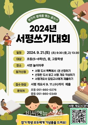 (비씨엔뉴스24) 부산광역시교육청은 21일 오전 9시 서면 놀이마루, 지오파트너스에서 부산지역 초·중·고등학생 307명을 대상으로 ‘서평 쓰기 대회’를 개최한다.
