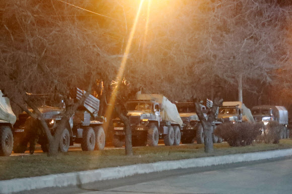 ‘친러 반군 통제’ 우크라 도네츠크서 이동하는 군용 차량 - 23일(현지시간) 친(親)러시아 반군이 통제하는 우크라이나 동부 도네츠크 외곽 도로에서 군용 차량이 줄지어 이동하고 있다. 블라디미르 푸틴 러시아 대통령은 최근 도네츠크와 인근 루간스크 등 우크라이나 동부지역 친러 분리주의자들의 독립을 승인한 데 이어 24일에는 “러시아는 우크라이나 내에서 특별 군사작전을 수행할 것”이라고 선언했다. 2022.2.24 〈도네츠크 로이터 연합뉴스〉