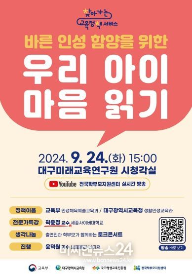 (비씨엔뉴스24) 대구시교육청은 9월 24일 오후 3시 대구미래교육연구원 시청각실에서 초·중·고 학부모 220여 명을 대상으로 ‘2024 학부모 대상 찾아가는 교육정책 서비스’를 개최한다.