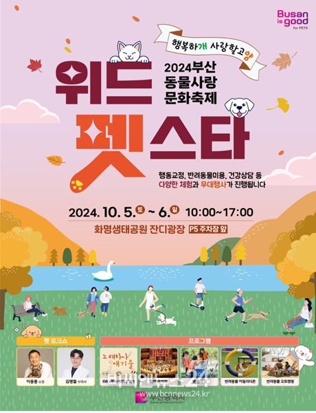 (비씨엔뉴스24) 부산시는 10월 5일부터 6일까지 이틀간 화명생태공원 잔디광장에서 부산 동물사랑 문화축제 '2024 위드펫스타'를 개최한다고 밝혔다.