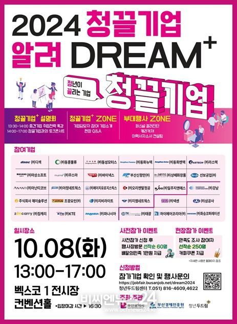 (비씨엔뉴스24) 부산시는 내일(8일) 오후 1시 30분 벡스코 제1전시장 컨벤션홀에서 '부산 청끌(청년이 끌리는) 기업 알려 드림(DREAM)+'을 개최한다고 밝혔다.