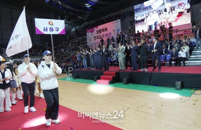 (비씨엔뉴스24) 하윤수 부산광역시교육감이 5일 오후 6시 강서체육공원 실내체육관에서 선수단, 시민 등 4천여 명이 참가한 가운데 열린 ‘제35회 부산시민체육대축전 전야제’에서 선수단을 맞이한 후 인사말을 하고 있다.