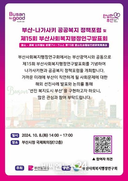 (비씨엔뉴스24) 부산시는 오늘(8일) 오후 2시부터 5시까지 시청 국제회의장에서 '부산-나가사키 공공복지 정책포럼 및 제15회 부산사회복지행정연구발표회'를 개최한다고 밝혔다.