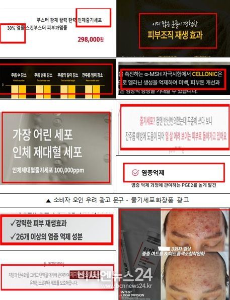 '가' 업소는 줄기세포 관련 화장품의 경우 줄기세포 배양액이 아닌 줄기세포가 들어 있는 것으로 소비자가 오인할 수 있는 광고는 할 수 없음에도 불구하고 '인체 줄기세포 30퍼센트(%) 앰플, 주름수 감소, 주름범위 감소, 주름길이 감소, 손상된 피부세포의 재생효과, 미백' 등의 표현으로 줄기세포 배양액이 포함된 화장품을 마치 줄기세포가 들어가 피부 재생 효과와 주름 개선, 미백 등 효능이 있는 것처럼 거짓·과대 광고를 하다가 적발됐다.