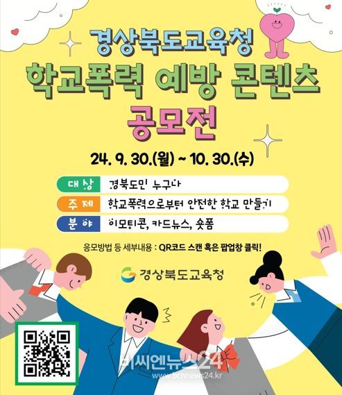 (비씨엔뉴스24) 경북교육청은 30일까지 학교폭력 없는 안전한 학교문화를 조성하기 위한 ‘학교폭력 예방 콘텐츠 공모전’을 진행한다고 밝혔다.
