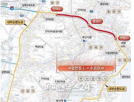‘부산 내부순환(만덕 부터 센텀) 도시고속화도로’는 총연장 9.62킬로미터(km) 왕복 4차로로, 북구 만덕동(만덕대로)과 해운대구 재송동(수영강변대로)을 연결한다.