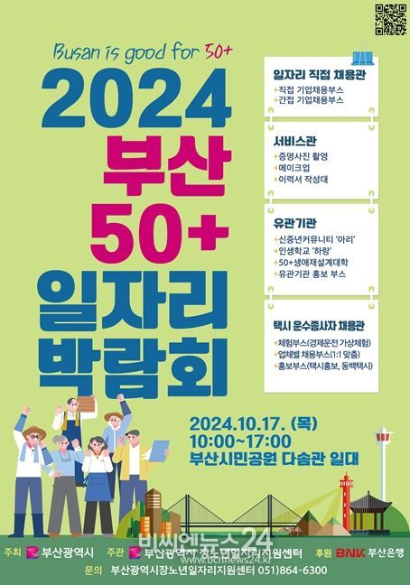 (비씨엔뉴스24) 부산시는 내일(17일) 오전 10시부터 오후 5시까지 부산시민공원 다솜관 일대에서 신중년 세대의 인생 2막 도전을 지원하는 '2024년 부산 50+일자리 박람회'를 개최한다고 밝혔다.