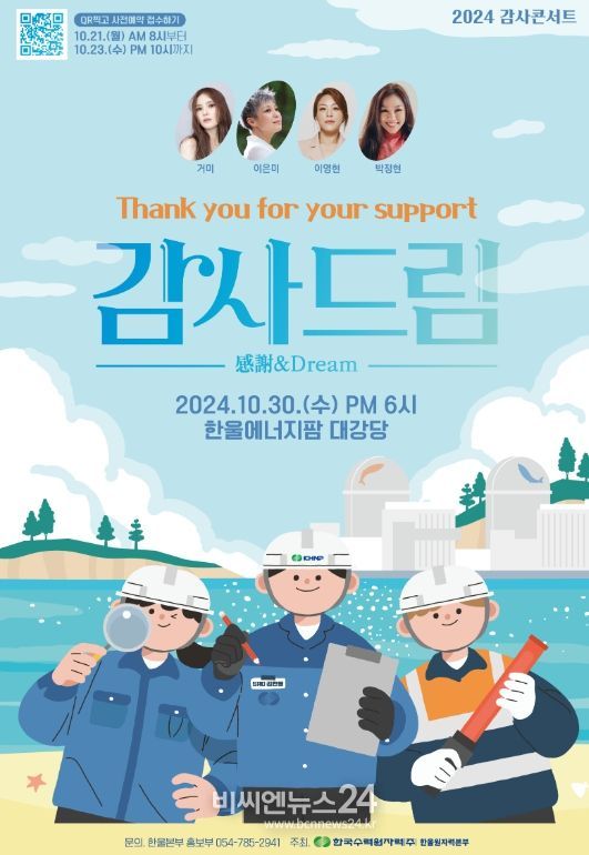 (비씨엔뉴스24) 한국수력원자력(주) 한울원자력본부는 10월 30일 18시 한울에너지팜 대강당에서 2024년도 한울본부 ‘감사드림(感謝·Dream)’콘서트를 시행한다.