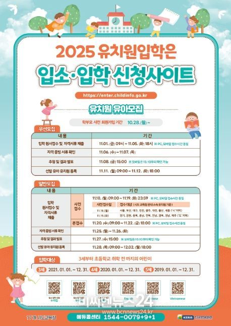 (비씨엔뉴스24) 제주특별자치도교육청은 2025학년도 유치원 유아 모집을 11월 1일부터 유치원입학관리시스템 ‘입소·입학신청사이트’를 통해 진행한다.