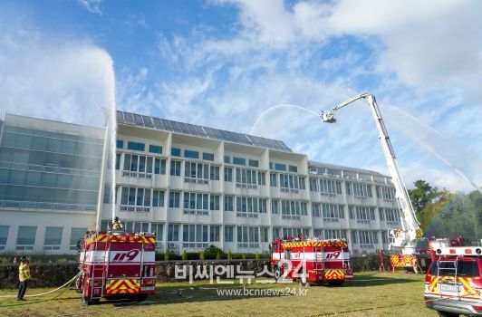 현장훈련은 제일요양원에서 원인미상 화재 발생을 시작으로 전기차 화재와 건축물 붕괴 등 복합 재난 상황을 가정해 진행됐다. 소방대원들은 인명구조와 화재진압, 시설물 복구 등 실전에 대비한 훈련을 실시했다.