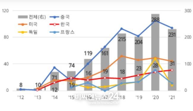 최근 10년간 가장 많은 출원을 한 국가는 중국(38.6%, 533건)이며, 미국(20%, 276건)이 그 뒤를 이었다. 한국은 12.1%(167건)로 3위를 차지했으나, 최근 5년간 가장 높은 출원량 증가를 보여(연평균 13%), 앞으로 더욱 빠른 성장이 기대된다.