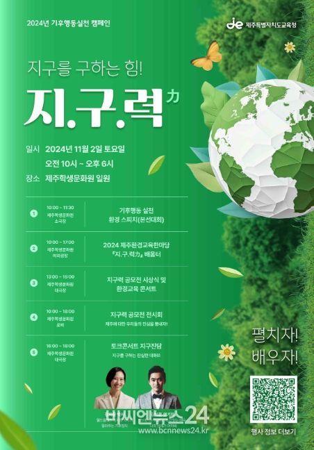 (비씨엔뉴스24) 제주특별자치도교육청은 11월 2일 2024년 기후행동실천 운동‘지구를 구하는 힘, 지·구·력力’의 일환으로, 제주학생문화원 대극장에서 환경교육콘서트 (펼치자)와 탄소중립실천 배움터 (배우자), 토크콘서트 (지·구·진·담)를 개최하여 3개월에 걸친 지·구·력力 대단원의 막을 내린다.