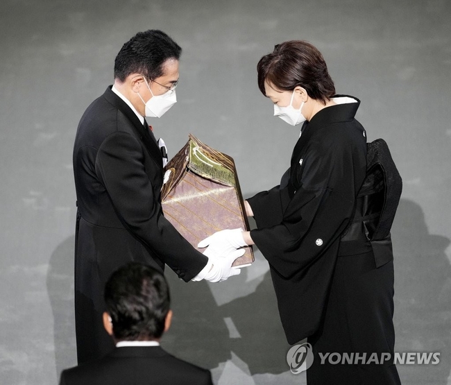 아베 전 총리 부인 아키에 여사가 아베 전 총리의 유골함을 들고 기시다 총리의 안내를 받으며 입장한 뒤 국장은 시작됐다.