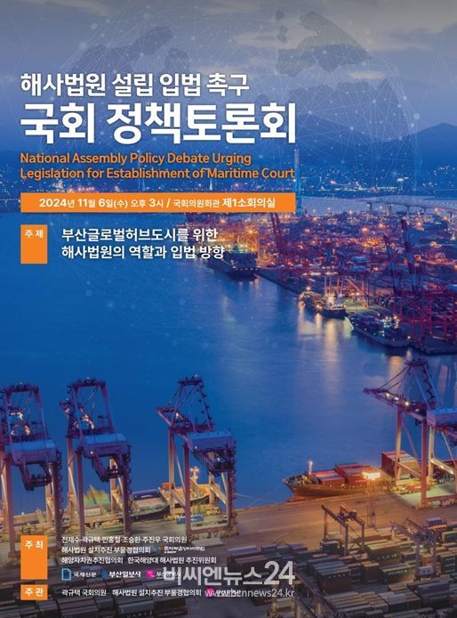 (비씨엔뉴스24) 부산시는 오늘(6일) 오후 3시 국회의원회관 제1소회의실에서 '해사법원 설립 입법촉구 국회 토론회'를 개최한다고 밝혔다.