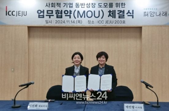 (비씨엔뉴스24) 제주국제컨벤션센터는 14일 오후 2시 ICC JEJU 203호에서 양 기관 대표자가 참석한 가운데 사회적협동조합 희망나래와 ‘사회적가치 및 사회적경제 활성화를 위한 업무협약’을 체결했다고 밝혔다.