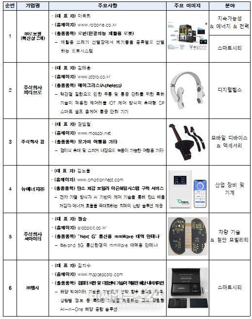 혁신상 수상 기업은 총 6개 사로, ▲로보원(인공지능재활용 로봇, 로빈) ▲㈜피티브로(턱관절 질환 통증완화 홈케어 기기, 에어크리스) ▲㈜짐(접이식 휴대 여행용 기타, 모가비) ▲뉴에너지㈜(탄소 저감 보일러 이온히팅시스템 구독 서비스) ▲㈜씨아이티(Beyond 5G 통신환경의 mmWave 대역용 안테나) ▲㈜맵시(컴퓨터 비전 및 다중센서 기술이 적용된 해상 내비게이션)다. 이 중 로보원은 2개 분야에서 혁신상을 받았다.
