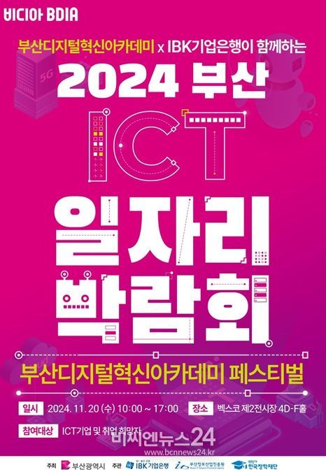 (비씨엔뉴스24) 부산시와 부산정보산업진흥원, 아이비케이(IBK)기업은행, 13개 부산지역대학은 내일(20일) 오전 10시부터 오후 5시까지 벡스코 제2전시장에서 '2024 부산디지털혁신아카데미 페스티벌'을 개최한다고 밝혔다.
