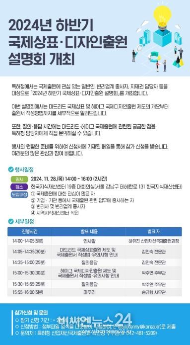 (비씨엔뉴스24) 특허청은 11월 28일 14시 한국지식재산센터(서울시 강남구)에서 국제출원에 관심 있는 일반인, 변리업계 종사자, 기업 지식재산권 담당자 등을 대상으로 ‘2024년 하반기 국제상표·디자인출원 설명회’를 개최한다고 밝혔다.