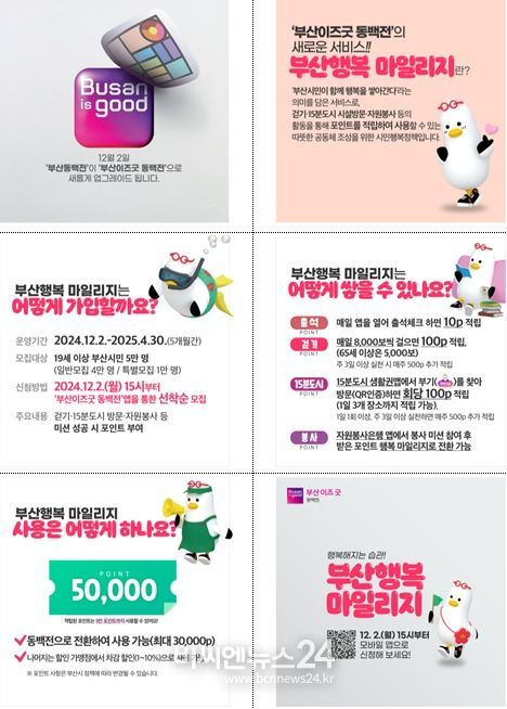 (비씨엔뉴스24) 부산시는 오는 12월 2일 오후 3시부터 '부산이즈굿 동백전' 모바일 앱을 통해 '부산행복 마일리지' 시범사업에 참여할 5만 명을 선착순 모집한다고 밝혔다.