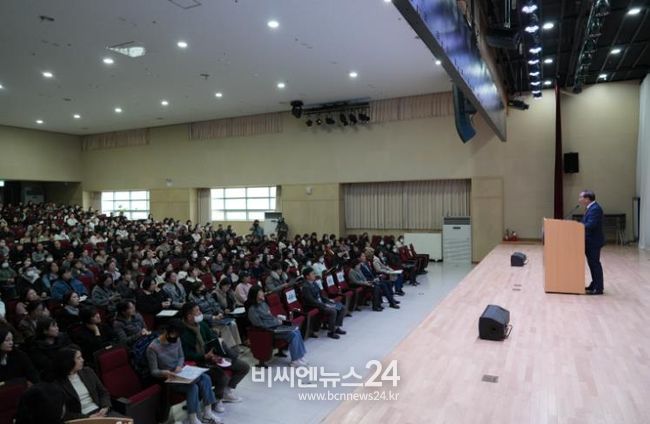 (비씨엔뉴스24) 하윤수 부산광역시교육감이 29일 오후 2시 부산교육연구정보원 대강당에서 초등 6학년 학부모 등 470여 명이 참석한 가운데 열린 ‘예비 중1 학부모 연수’에서 인사말을 하고 있다.