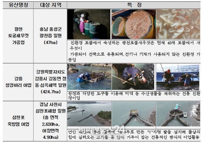 이번에 국가중요어업유산으로 지정된 제14호 ‘강릉창경바리어업’은 ‘창경(窓鏡)’이라는 도구를 이용해 수중에서 맑은 시야를 확보하여 해조류 및 저서생물 등을 채취하는 어업이다. 제15호 ‘광천토굴새우젓가공업’은 자체적으로 수분을 생성하는 풍화암 재질로 이루어진 친환경 토굴에서 새우젓을 숙성・발효시키는 가공업이다. 제16호 ‘삼천포죽방렴어업’은 연안의 좁은 물목에 대나무로 만든 ‘V’자형 발을 설치해 물살의 힘에 실려 오는 물고기를 통 안에 가두어 잡는 전통적인 어업방식이다.