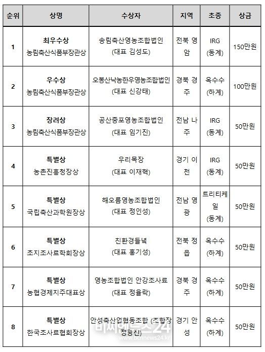 올해 최우수상은 전남 영암의 송림축산영농조합법인(대표 김성도)이 수상했으며, 우수상은 경북 경주의 오봉산낙농한우영농조합법인(대표 신강태), 장려상은 전남 나주의 공산중포영농조합법인(대표 임기진), 특별상은 경기 이천의 우리목장(대표 이재혁), 전남 영광의 해오름영농조합법인(대표 정인성), 전북 정읍의 친환경들녘(대표 홍기성), 경북 경주의 영농조합법인 안강조사료(대표 정율락), 경기 안성의 안성축산업협동조합(조합장 정광진)이 각각 수상했다.