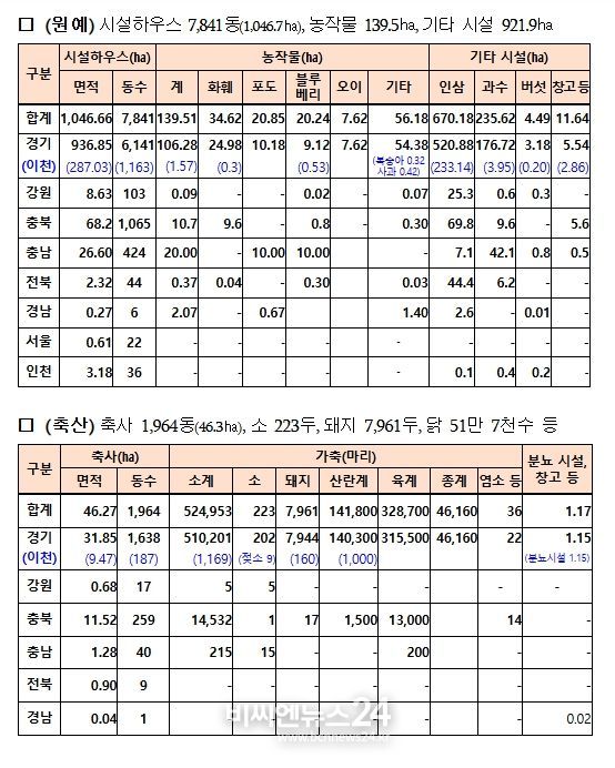 지난 11월 26일부터 28일까지 전국에 내린 눈으로 경기, 강원, 충청, 전북 등 지역에서 시설하우스와 축사 등 농업분야 약 2,015㏊의 피해(잠정, 12.4. 신고기준)가 발생한 것으로 집계됐다. 지역별로는 경기도에서 가장 많은 1,676㏊(시설하우스 약 937㏊, 인삼시설 약 521㏊, 과수 177㏊, 버섯 3㏊, 축사 약 32㏊ 등) 피해가 발생했고, 충청북도에서도 약 165㏊의 피해가 발생했다고 신고했다.