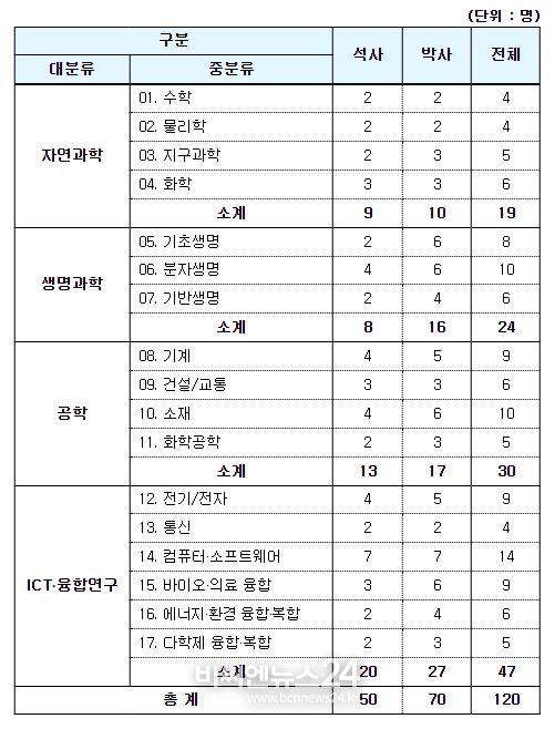 분야별 선발인원은 신청 접수 인원에 비례 배분하여, 대분류 기준으로 △자연과학 총 19명(석사 9명, 박사 10명), △생명과학 총 24명(석사 8명, 박사 16명), △공학 총 30명(석사 13명, 박사 17명), △ICT‧융합연구 총 47명(석사 20명, 박사 27명)을 선발했다.
