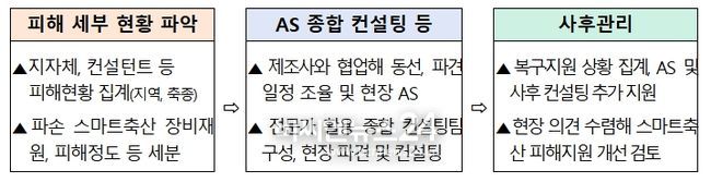 이를 위해, 농식품부와 축산물품질평가원은 합동 TF팀 설치해 피해상황 파악, 긴급 AS지원, 종합컨설팅팀 파견 등 피해 복구를 집중 관리해 오고 있다.