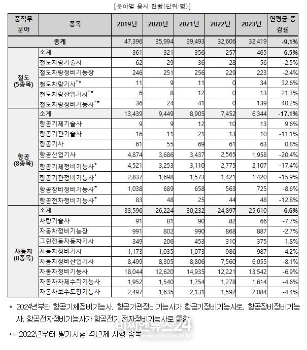 철도, 항공 및 자동차 분야 필기시험 응시자 인원은 최근 5년(‘19년~’23년) 연평균 9.1% 감소했다.