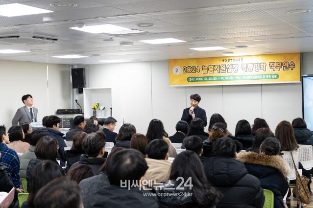 (비씨엔뉴스24) 최윤홍 부산광역시교육감 권한대행이 20일 오전 9시 명지늘봄전용학교에서 늘봄지원실장 68명을 대상으로 열린 역량 강화 연수에서 특강을 하고 있다.