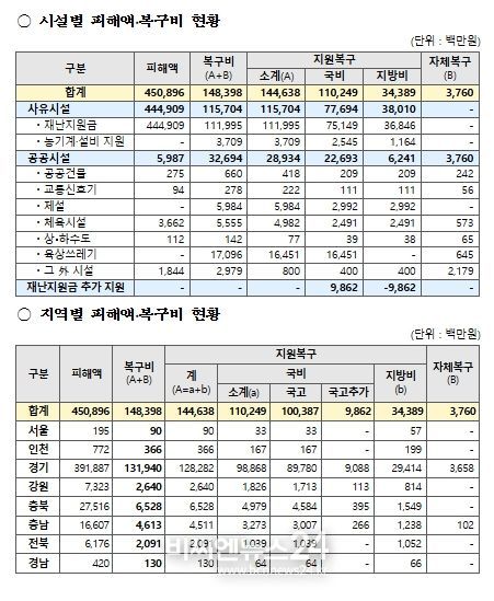 그간 정부는 피해지역의 신속한 수습을 위해 자치단체에 재난안전특교세 38억 원을 긴급 지원했으며, 복구대책지원본부 운영을 통해 응급복구 인력과 장비 투입, 피해주민 생활 안정에 필요한 사항 안내 등 행·재정 지원도 아끼지 않았다.