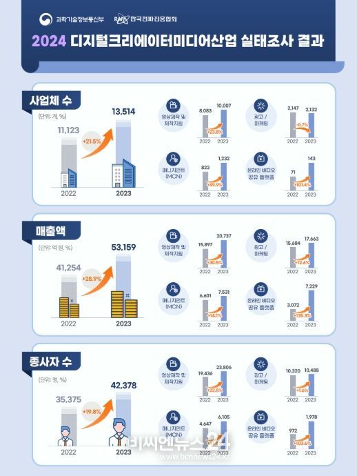(비씨엔뉴스24) 과학기술정보통신부와 한국전파진흥협회는 2023년 국내 디지털 창작자 매체(크리에이터 미디어) 산업의 현황을 살펴볼 수 있는'2024년 디지털크리에이터미디어산업 실태조사'결과를 발표했다.