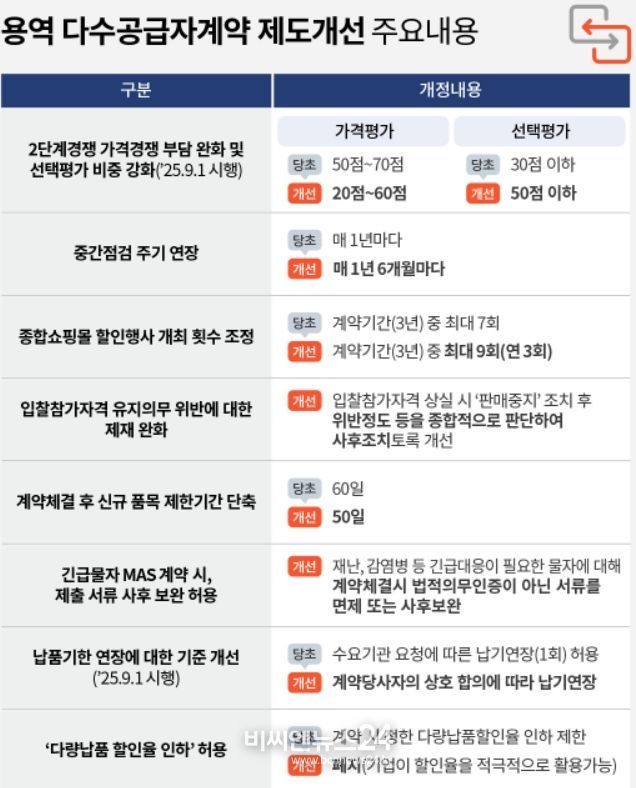 (비씨엔뉴스24) 조달청이 '용역 다수공급자계약 관련 행정규칙 2종'과 관련해 2단계경쟁 시 가격평가 비중 축소 등 조달기업의 부담은 덜어주고, 제도운영의 효율성은 높이는 방향으로 개선해 2025년 1월 6일부터 시행한다.