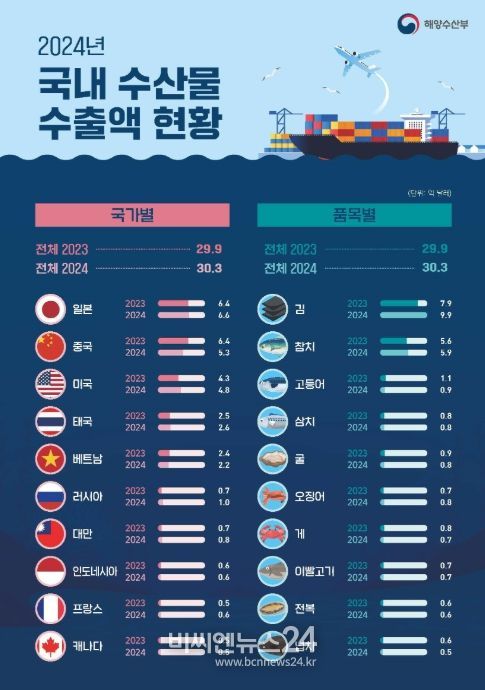 (비씨엔뉴스24) 해양수산부는 2024년 수산식품 수출 총액이 30.3억 달러(전년 대비 +1.2%)를 기록했다고 밝혔다. 주요 품목의 수출액은 수출 1위 품목인 김이 997백만 달러(1.3조 원)를 기록하여 2년 연속 1조 원을 달성했다. 뒤를 이어 수출 2위 품목인 참치는 전년 대비 4.7% 증가한 589백만 달러를 기록했다.