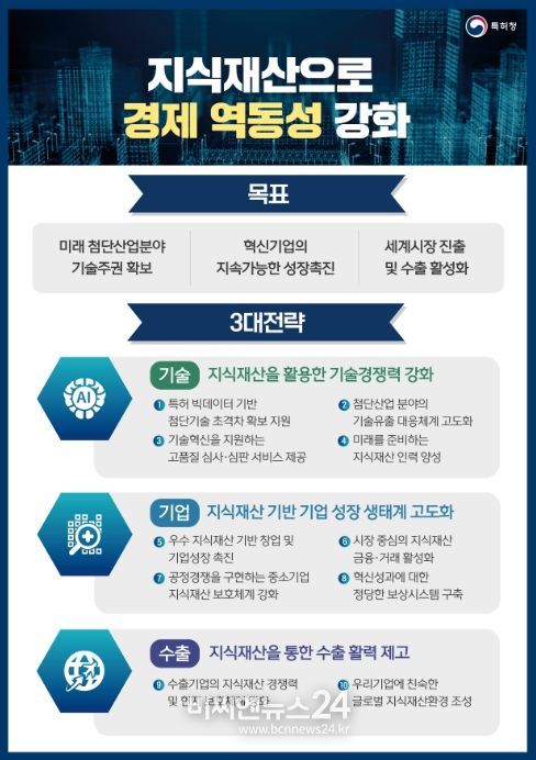 지난해는 어려운 여건 속에서도 국내 특허출원이 24.6만여 건으로 역대 최대치를 기록(246,245건)하고, 지식재산 금융 규모도 10조원을 돌파(’24.8)했다. 이러한 의미있는 지표들은 위기 속에서도 우리 경제의 잠재력이 유지되고 있음을 보여준다. 특허청은 이처럼 높은 지식재산 역량을 십분 활용하기 위해 미래 첨단산업분야 기술주권 확보, 혁신기업의 지속가능한 성장 촉진, 세계시장 진출 및 수출 활성화를 목표로 삼고, 3대 추진전략과 10개 중점과제를 제시했다.