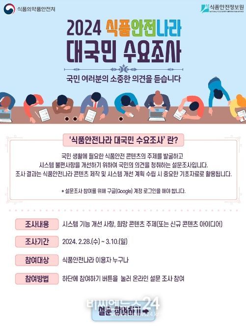 (비씨엔뉴스24) 식품의약품안전처는 식품안전나라 누리집을 사용자 중심으로 개선하기 위한 대국민 설문 조사를 2월 28일부터 3월 10일까지 누리집을 통해 실시한다고 밝혔다.