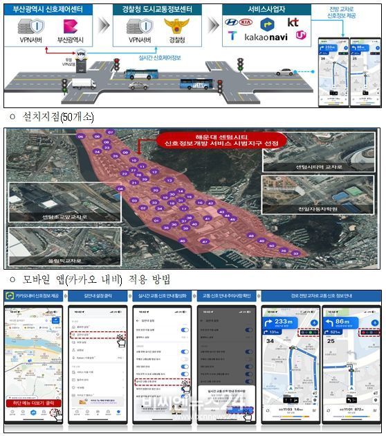 먼저, '실시간 신호정보 개방' 기반(인프라)을 구축해 센텀지구 일원에서 내비게이션을 통해 실시간 신호정보 확인이 가능해진다.