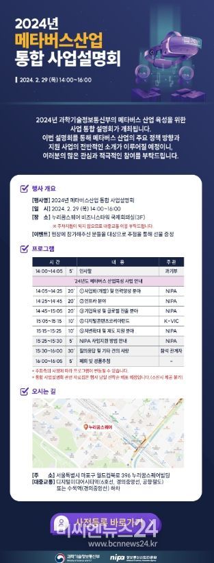 이를 위해 2월 29일 오후 2시, 서울 상암동 누리꿈스퀘어(3층, 국제회의실)에서 '2024년 메타버스산업 통합 사업설명회'를 개최하여 사업에 참여하고자 하는 기업을 대상으로 사업별 계획에 대해 상세하게 소개하고 기업의 목소리를 적극적으로 청취할 예정이다. 아울러 보다 많은 기업들이 설명회에 참여할 수 있도록 온라인 생중계도 병행하여 진행할 예정이다.