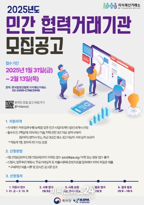(비씨엔뉴스24) 특허청은 1월 31일~2월 13일까지 지식재산(IP) 거래시장 활성화를 위해 지식재산거래소(한국발명진흥회 소속)와 함께 지식재산 거래를 공동 중개할 ‘민간 협력거래기관’ 6개사를 신규 모집한다고 밝혔다.