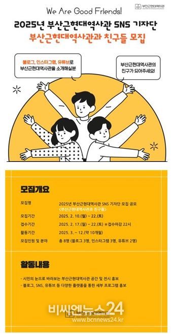 (비씨엔뉴스24) 부산근현대역사관은 오는 17일부터 22일까지 역사관의 매력을 널리 전파할 사회관계망서비스(SNS) 기자단 '2025년 부산근현대역사관과 친구들'을 모집한다고 밝혔다.