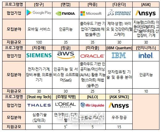 이번 모집 공고는 ①창구(구글플레이 협업, 모바일 서비스 분야), ②엔업(엔비디아 협업, 인공지능 분야), ③마중(마이크로소프트 협업, 클라우드 기반 기업 대 기업(B2B) 해법(솔루션) 분야), ④다온다(다쏘시스템 협업, 제약·생명(바이오) 및 건강관리(헬스케어) 분야), ⑤ASK(앤시스코리아 협업, 지능형(스마트) 이동수단(모빌리티), 심층기술(하이테크), 산업장비, 기계 분야), ⑥지중해(지멘스 협업, 전자·전기·기계, 장비·부품, 의료용 기기 분야), ➆정글(아마존 웹 서비스 협업, 인공지능 및 서비스형 소프트웨어(SaaS) 분야), ➇미라클(오라클 협업, 클라우드 기반 인공지능/머신러닝(AI/ML) 활용 지능형(스마트) 해법(솔루션) 분야), ➈IBM Quantum(IBM 협업, 양자컴퓨팅 기술 및 응용 분야), ⑩인지니어스(인텔 협업, 인공지능 분야), ⑪Trust my Tech(탈레스 협업, 심층기술(딥테크) 분야), ⑫로레알 빅뱅(로레알코리아 협업, 연구혁신 및 디지털 분야), ⑬N.E.O(에어리퀴드 협업, 친환경 에너지 분야), ⑭ASK 스페이스(앤시스코리아 협업, 우주·항공 분야) 등 총 14개 프로그램으로 구성되며, 공고에 지원을 희망하는 기업은 1개 프로그램을 선택하여 신청할 수 있다.