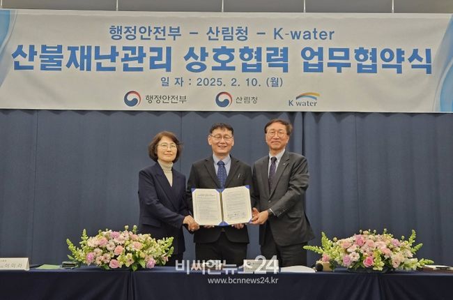 (비씨엔뉴스24) 행정안전부‧산림청‧한국수자원공사는 10일 대전광역시 대덕구 한국수자원공사 대청댐지사에서 산불관리 협력강화를 위한 3자 업무협약을 체결했다.