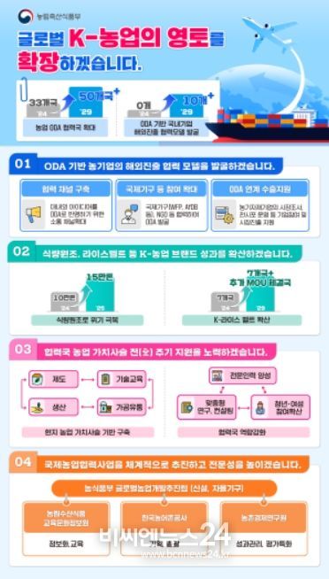 (비씨엔뉴스24) 농림축산식품부는 국제농업협력사업을 통해 협력국의 식량안보를 강화하고 농산업 성장을 지원하며 우리나라 농식품 산업의 글로벌 경쟁력을 강화하기 위한 '제1차 국제농업협력사업 종합계획(2025~2029)'을 발표했다.