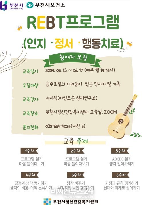 (비씨엔뉴스24) 부천시와 부천시정신건강복지센터는 알코올 중독 대상자들의 알코올에 대한 왜곡된 인지를 바로잡고, 정서조절능력 및 대인관계 기술을 향상하기 위한 알코올 교육 ‘인지·정서·행동치료(REBT) 프로그램’을 운영한다.