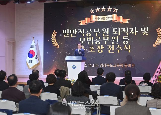 (비씨엔뉴스24) 경북교육청은 14일 본청 웅비관에서 ‘2024년도 하반기 일반직공무원 퇴직자 및 모범공무원 훈포장 전수식’을 개최했다.